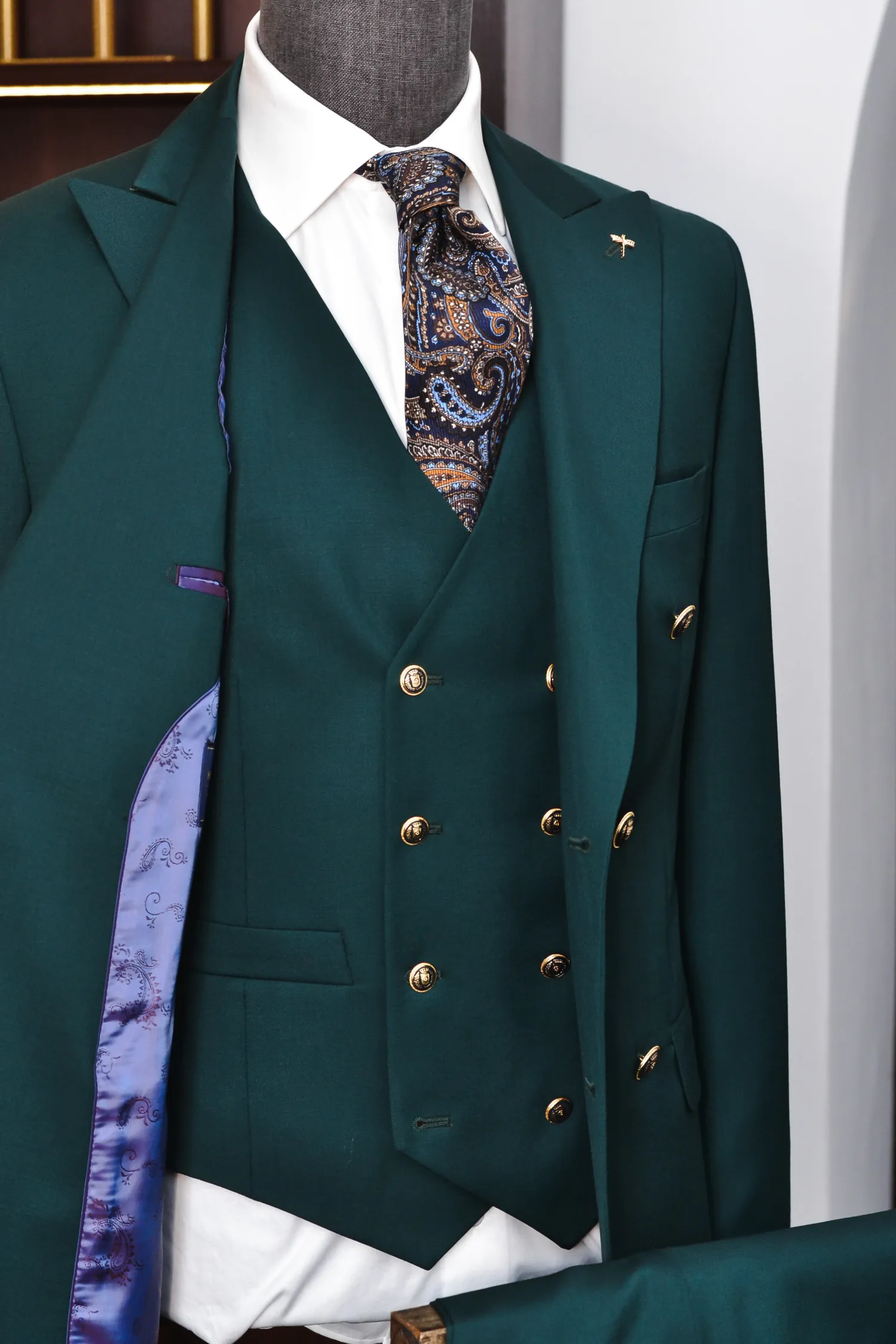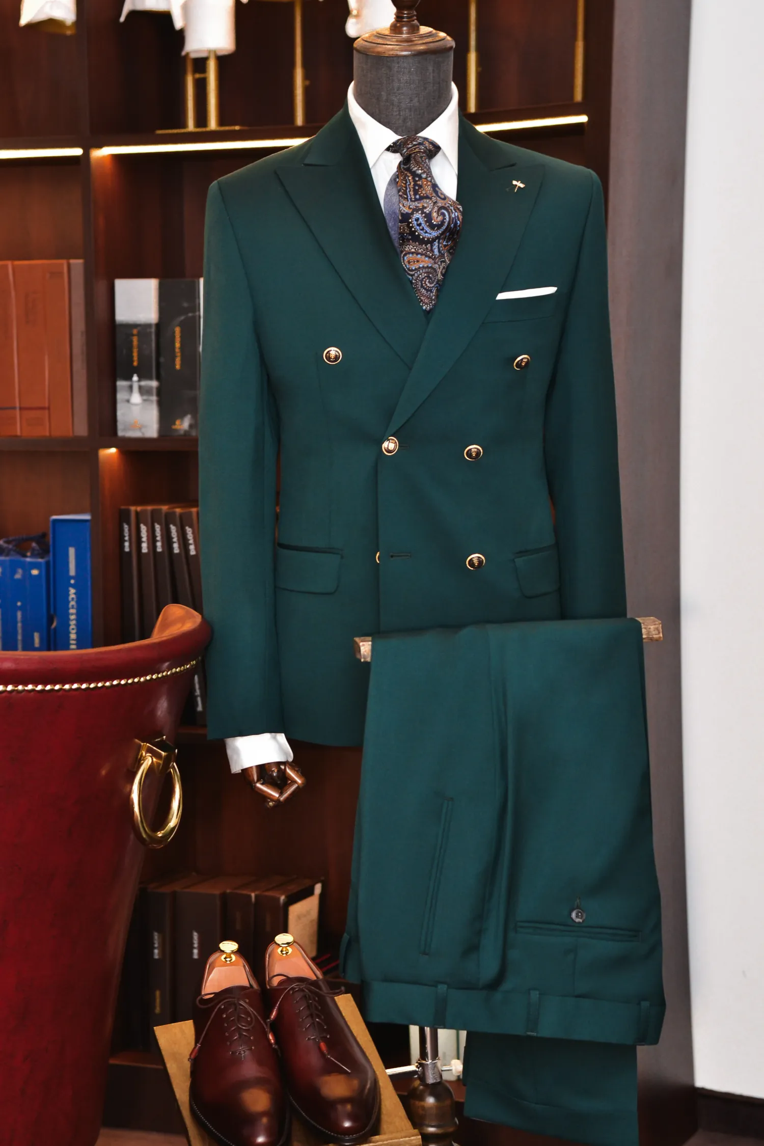 Butelkowo zielony garnitur w formie dwurzędówki z guzikami klubowymi na ślub klasyczny.