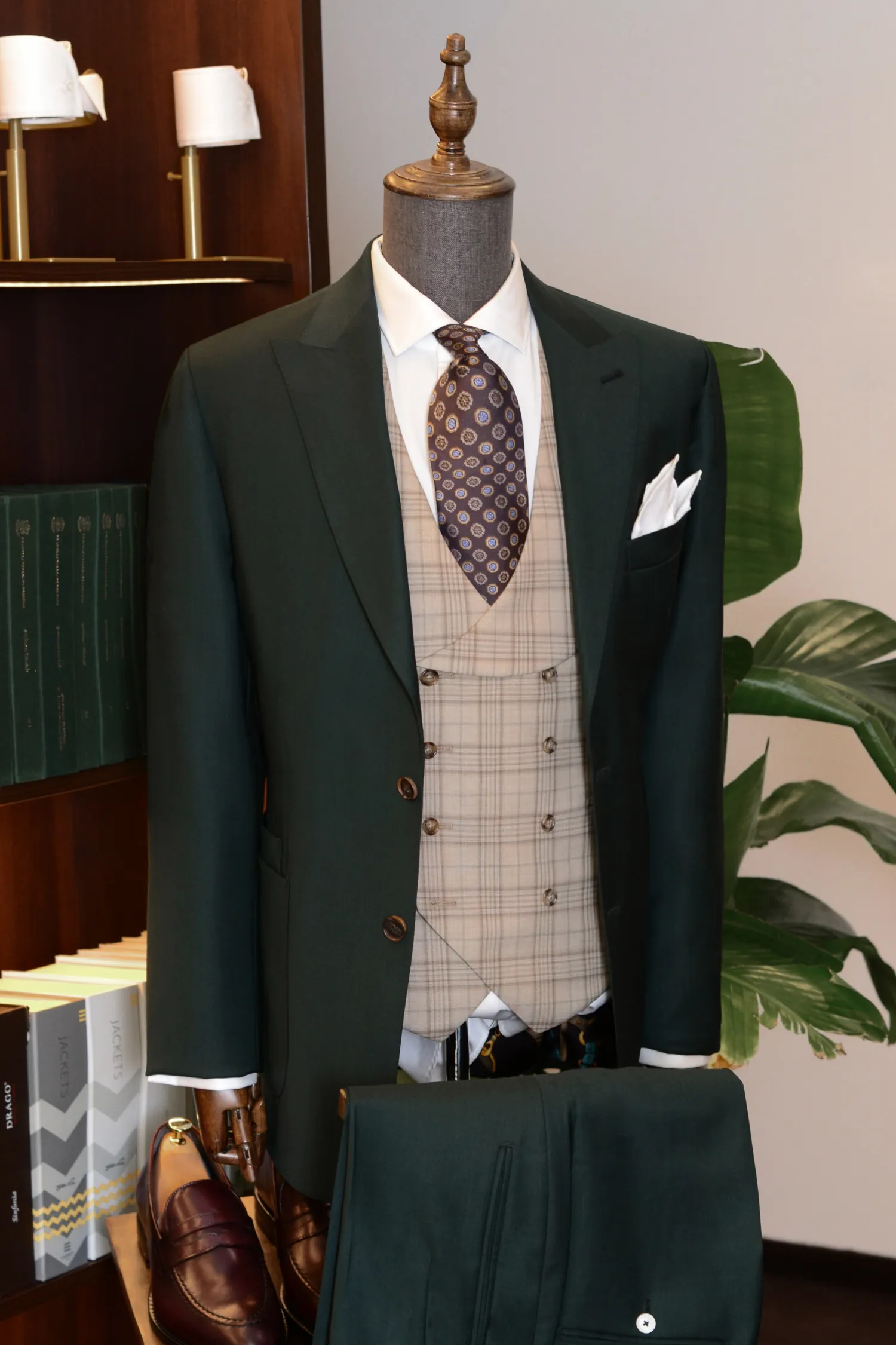 Butelkowo zielony garnitur z kraciastą kamizelką na ślub rustykalny.