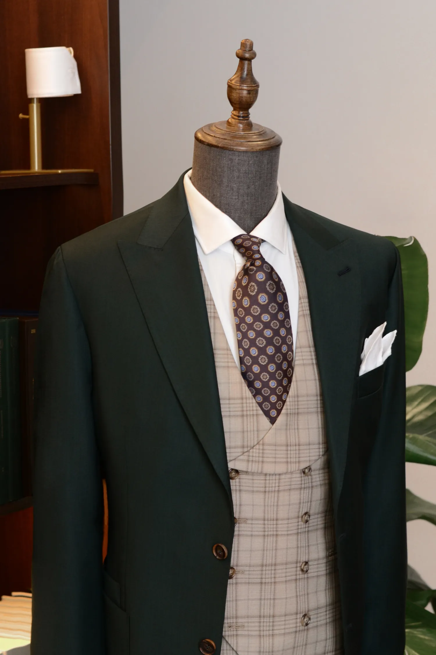 Ten model to najbardziej klasyczny wariant garnituru w kolorze butelkowej zieleni. W tym rozwiązaniu stawiamy na klasykę kroju – marynarka jednorzędowa z dwoma guzikami z przodu i z dwoma szlicami z tyłu. Ozdobą i niezwykłym dodatkiem do tego garnituru jest niewątpliwie kamizelka. Musimy przyznać, że w zdecydowanej większości ten model parujemy z kamizelką kontrastującą ze wzorem kraty. Ten wariant garnituru butelkowo zielonego sprawdzi się wybitnie z brązowymi i rudymi kolorami krat na kamizelkę i w tej stylizacji świetnie posłuży jako stylizacja Pana Młodego na ślub w stylu rustykalnym. Nie zapominajmy też o praktyczności tego rozwiązania – przyszły Pan Młody zyskuje uniwersalny garnitur, który w przyszłości, już po weselu, sparowany z inną kamizelką i innymi akcesoriami nabierze zupełnie nowego charakteru i będzie ubraniem, które łatwo wykorzystać na inne okazje.