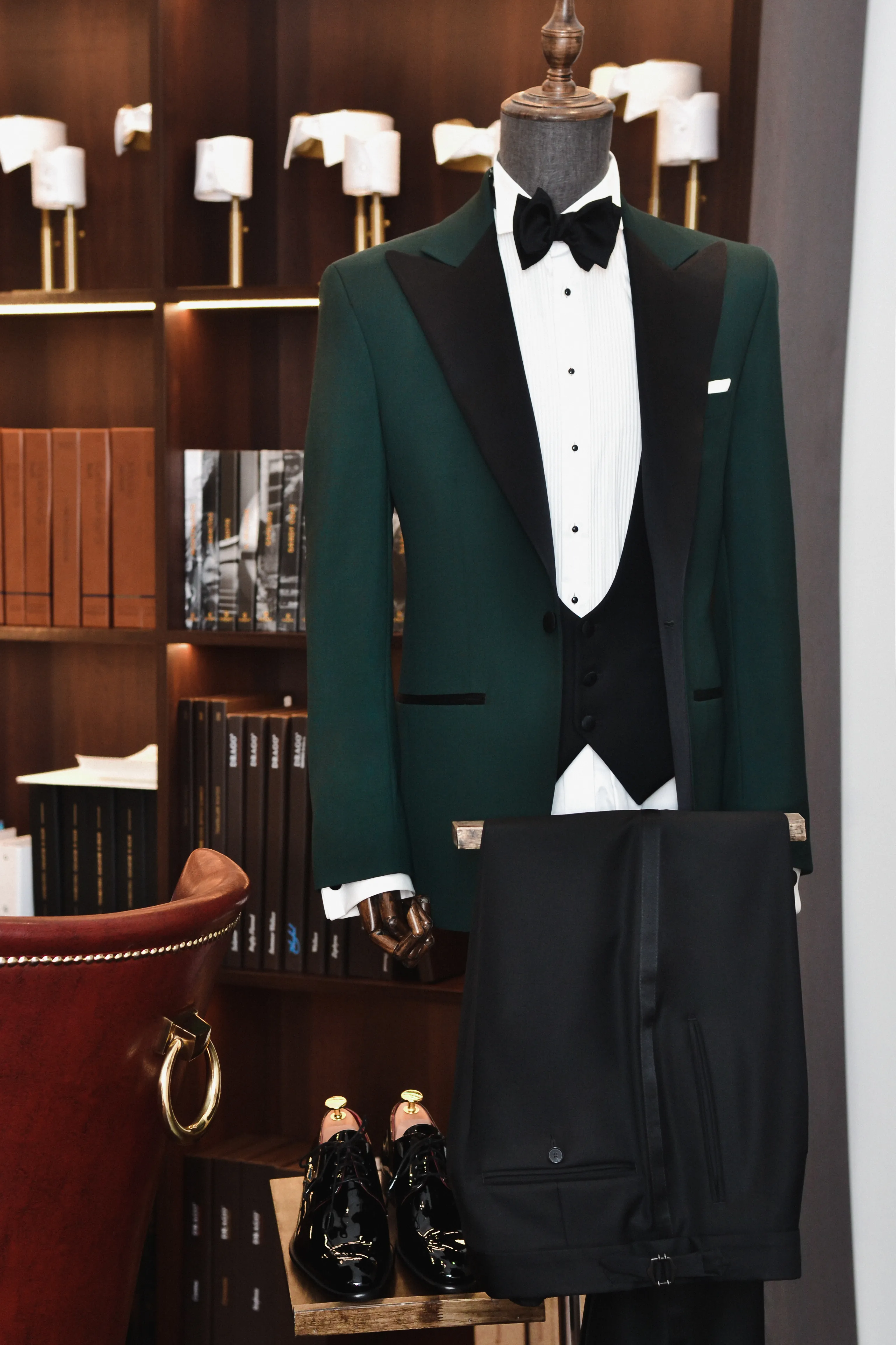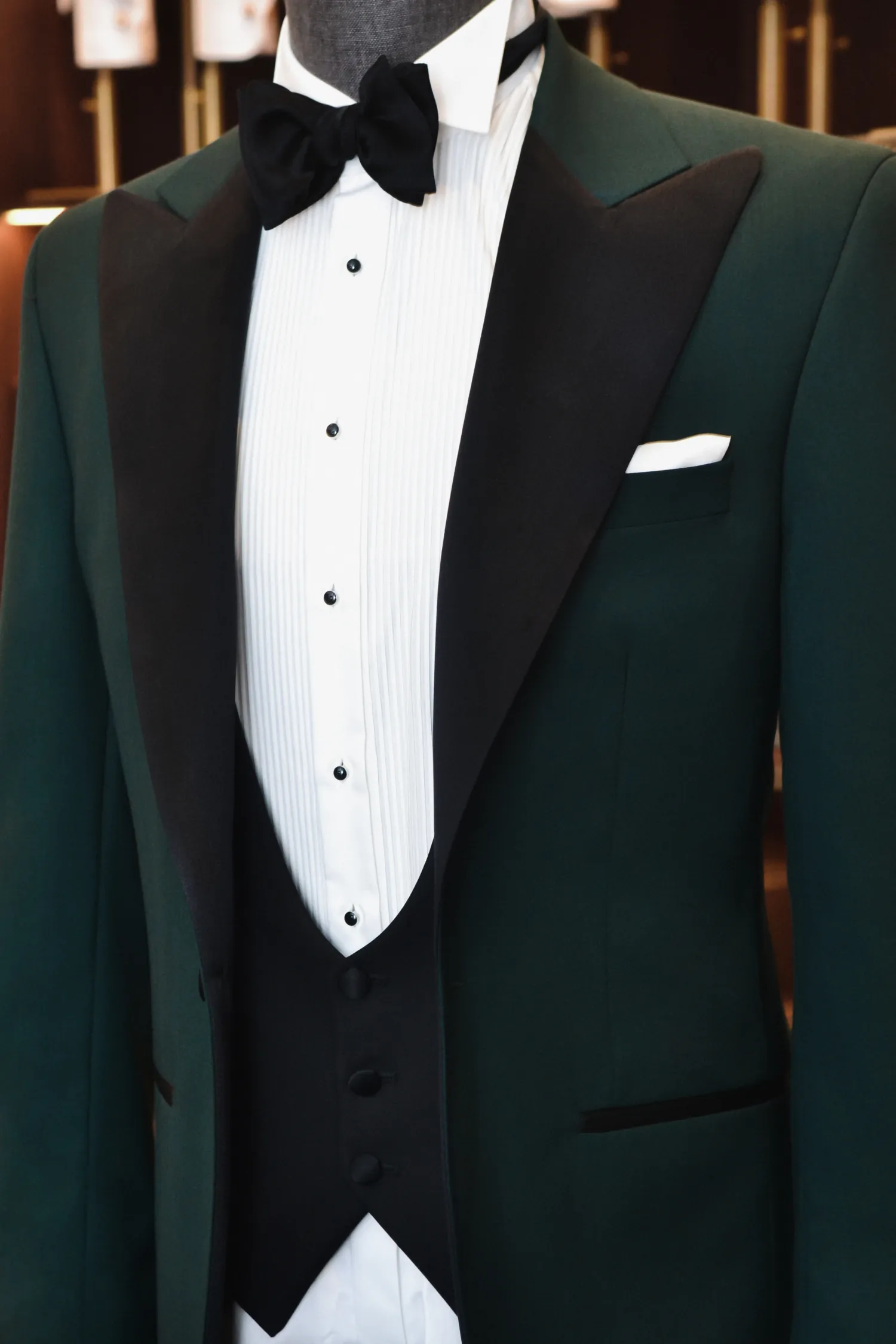 Najbardziej szykowna wersja butelkowej zieleni, czyli smoking. Doskonała opcja na ślub w stylu glamour i częsty wybór klientów chcących odejść od schematu iż „smoking może być tylko czarny”. Smoking w tym kolorze wygląda bardzo dostojnie i klasycznie. W tego typu stylizacji marynarkę w kolorze zieleni wzbogacamy czarnym, jedwabnym atłasem na szerokiej klapie w szpic i musimy zauważyć, że wbrew pozorom butelkowo zielony smoking wcale nie ustępuje w elegancji smokingom w kolorze czarnym czy midnight blue. Uzupełnieniem stylizacji są czarne spodnie z lampasem, niska kamizelka smokingowa oraz koszula smokingowa z biżuteryjnymi guzikami. Całość tworzy bardzo twarzowy i iście królewski zestaw.