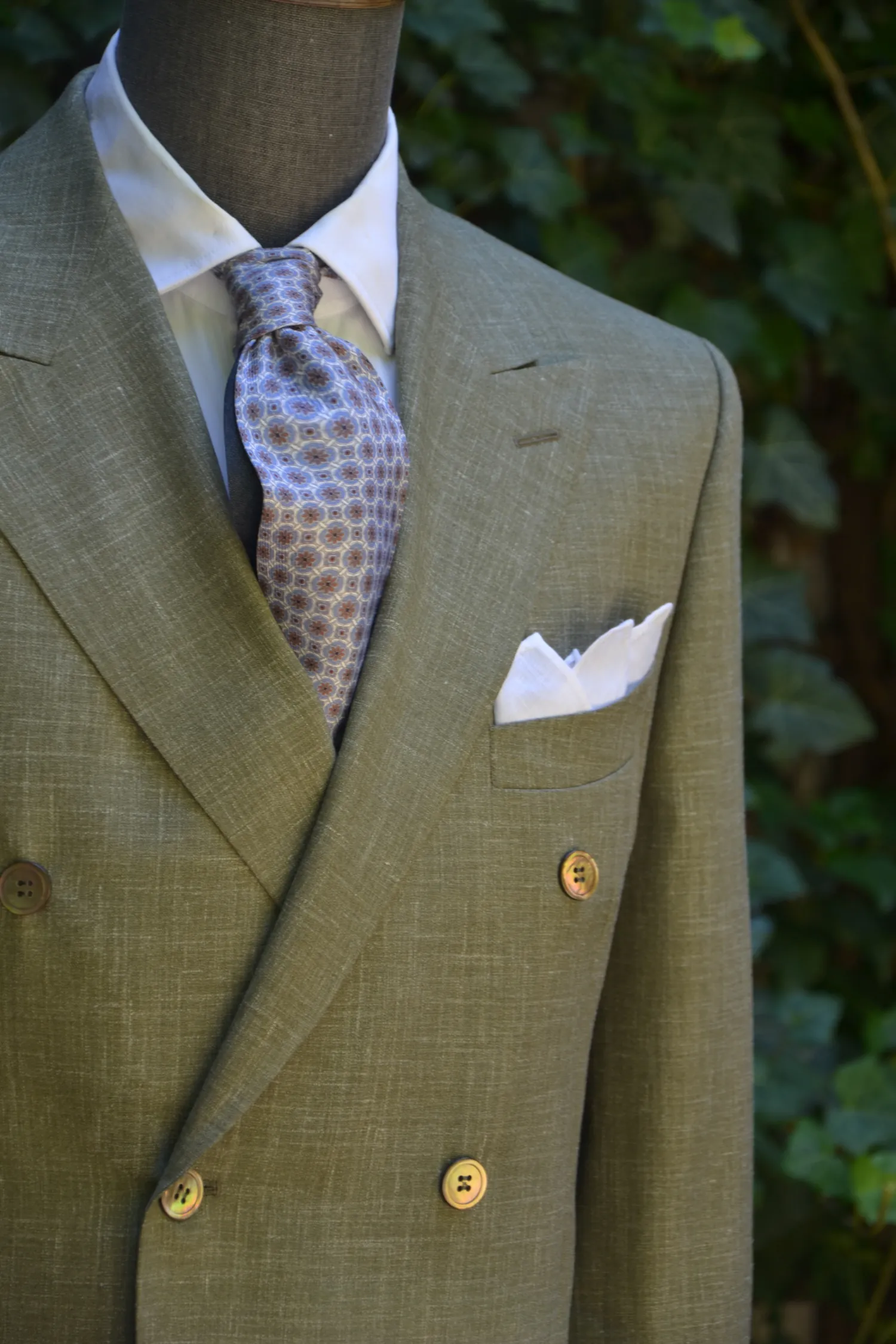 Dwurzędowy garnitur w kolorze oliwki z tkaniny Loro Piana — mieszanki wełny, lnu i jedwabiu.